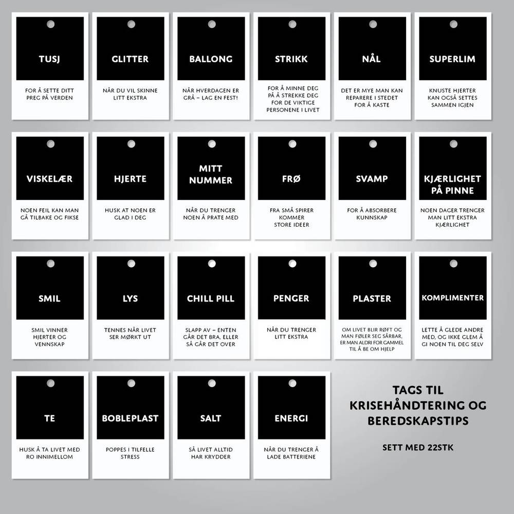Her får du et morsomt sett med 22gavelapper som kan brukes til mange anledninger. Du kan lage festlige 'krise og beredskapsgaver' som kan samles i...Her får du et morsomt sett med 22gavelapper som kan brukes til mange anledninger. Du kan lage festlige 'krise og beredskapsgaver' som kan samles i en boks eller du kan kombinere dette settet med en av våre Krise og beredskap vesker. Det er 22gavelapper i settet, men man trenger ikke bruke alle i en gave, lag en kombinasjon som passer til den du skal gi gaven til. Les mer