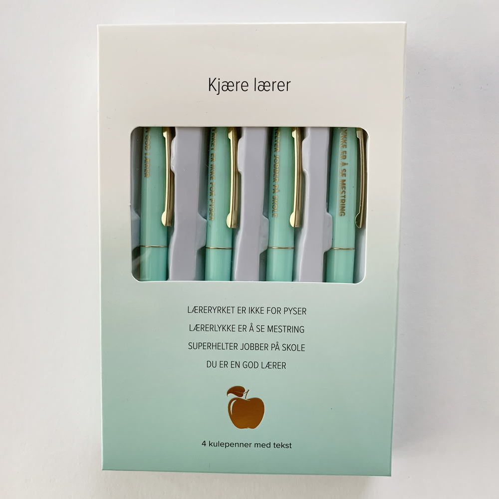 Pakken inneholder 4 kulepenner i mint med gulltekst. Tekstene beskriver en god lærer og læreryrket:
