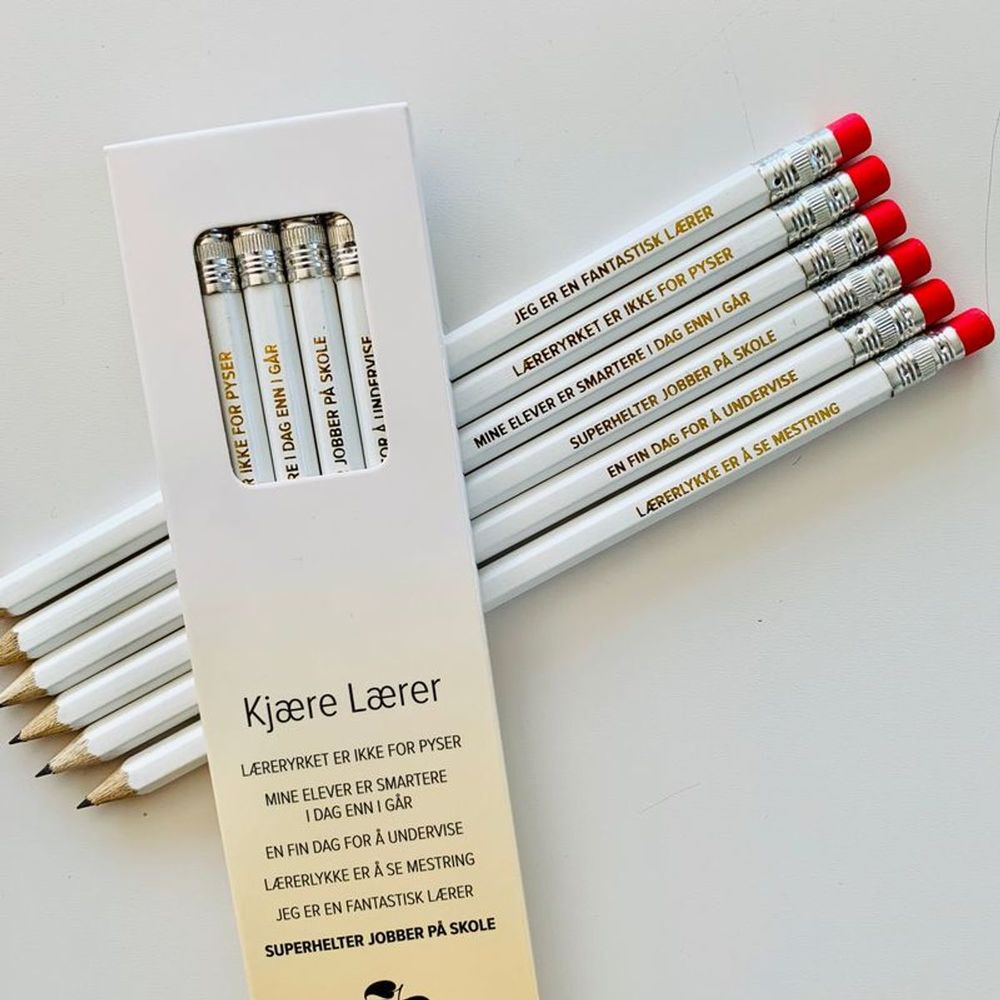 Pakken inneholder 6 HB blyanter i hvit med gulltekst. Tekstene beskriver læreryrket og er en mer humoristisk versjon.