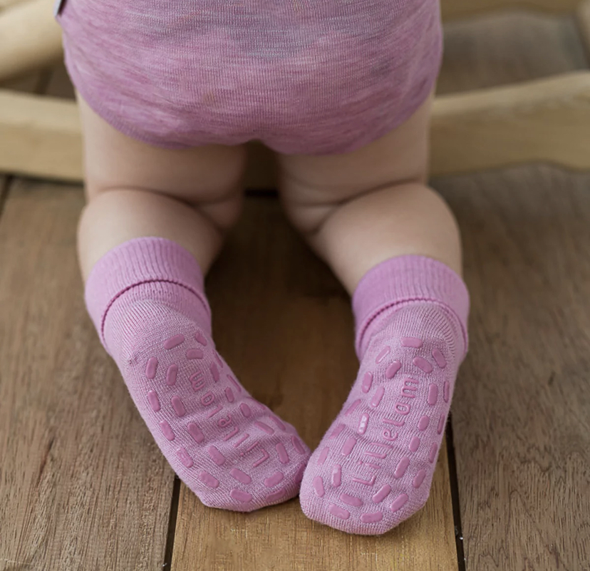 Å løpe rundt i barnehagen, eller å ta sine første skritt i ullsokker, kan være en utfordring. Derfor kan det være lurt å bruke sklisikre sokker! Våre ullsokker er laget av høykvalitets merinoull som puster, og derfor holder føttene varme og komfortable hele dagen, uten å bli klamme.