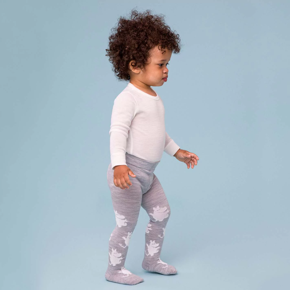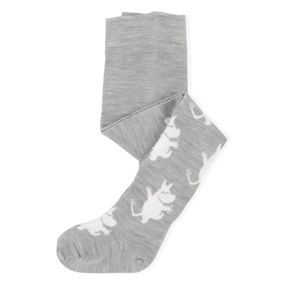 Ullstrømpebukse i den mykeste merinoull som ikke klør, med en god passform og kvalitet som varer. Strømpebuksen har mønster med mummitrollet på beina.