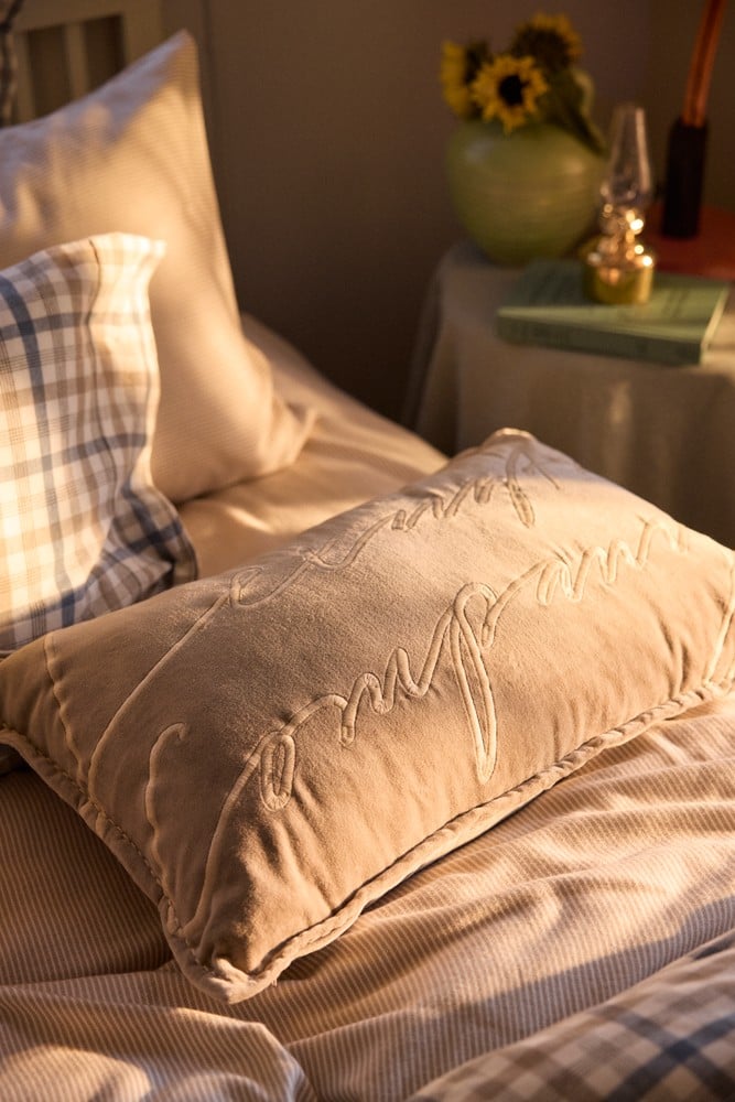 Gjør et tydelig designstatement i hjemmet ditt med vår Logo Organic Cotton Velvet Pillow. Med brodert Lexington-logotext over hele forsiden kombinerer denne luksuriøse puten stil...Gjør et tydelig designstatement i hjemmet ditt med vår Logo Organic Cotton Velvet Pillow. Med brodert Lexington-logotext over hele forsiden kombinerer denne luksuriøse puten stil med bærekraft. Håndlaget av den mykeste økologiske bomullsfløyelen og avsluttet med kraftige stikndetaljer i matchende farge, gir den både visuell appell og overlegen komfort.