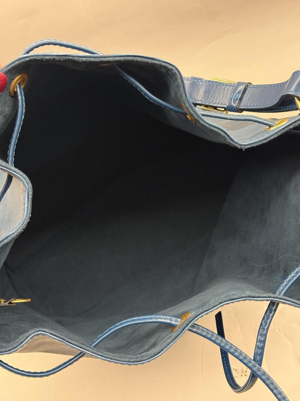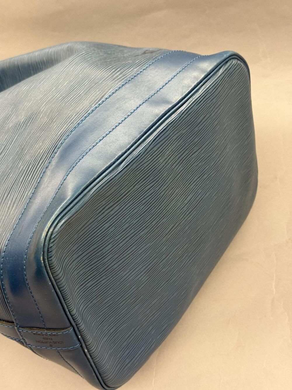 Louis Vuitton Epi Noé GM (den største) fra 1995, i blått skinn med hardware i gullfarget messing. Den har en stor lomme som lukkes med...Louis Vuitton Epi Noé GM (den største) fra 1995, i blått skinn med hardware i gullfarget messing. Den har en stor lomme som lukkes med drawstring og har regulerbar skulderreim.