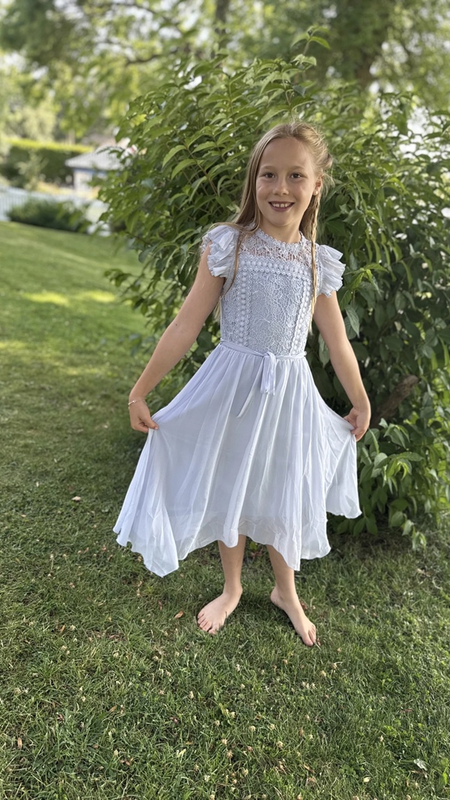 En elegant lyseblå kjole med blondetopp og lett, asymmetrisk chiffonskjørt. Overdelen har detaljert blomsterblonde. Kjolen lukkes med en liten knapp bak i nakken. Midjen markeres...En elegant lyseblå kjole med blondetopp og lett, asymmetrisk chiffonskjørt. Overdelen har detaljert blomsterblonde. Kjolen lukkes med en liten knapp bak i nakken. Midjen markeres av et smalt knytebelte i samme stoff. Luftig og lett. 100% Polyester, vaskes på 40 grader.Les mer