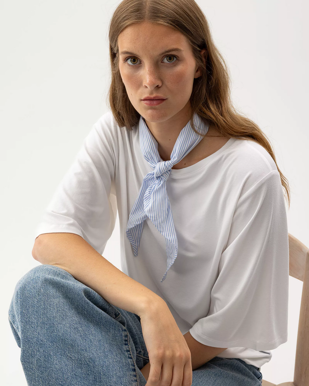 Trekantet skjerf i sprø bomullspoplin med brodert logo. Kan styles på flere måter, for eksempel rundt halsen eller på hodet. Kan matches med flere plagg...Trekantet skjerf i sprø bomullspoplin med brodert logo. Kan styles på flere måter, for eksempel rundt halsen eller på hodet. Kan matches med flere plagg i Marie-serien. Bærekraftig produsert i Europa.
