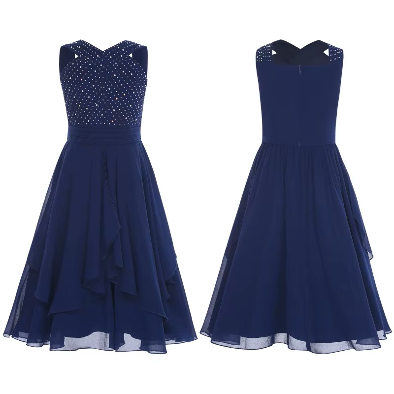 Søt kjole til jente og ungdom uten armer. Kjolen er fylt med små stener på overdelen. Skjørtet har medium lengde og er luftig og ledig.... Les mer