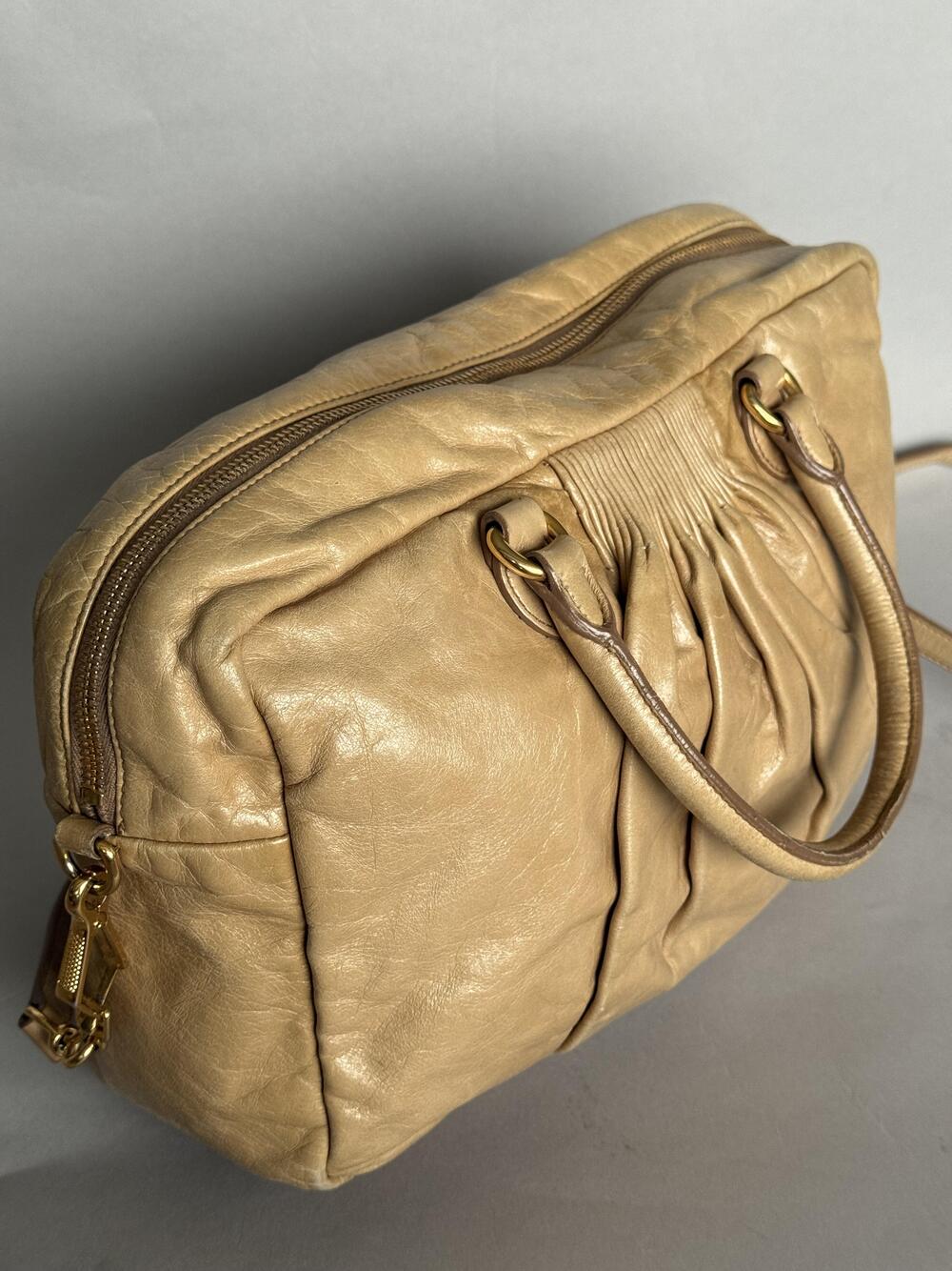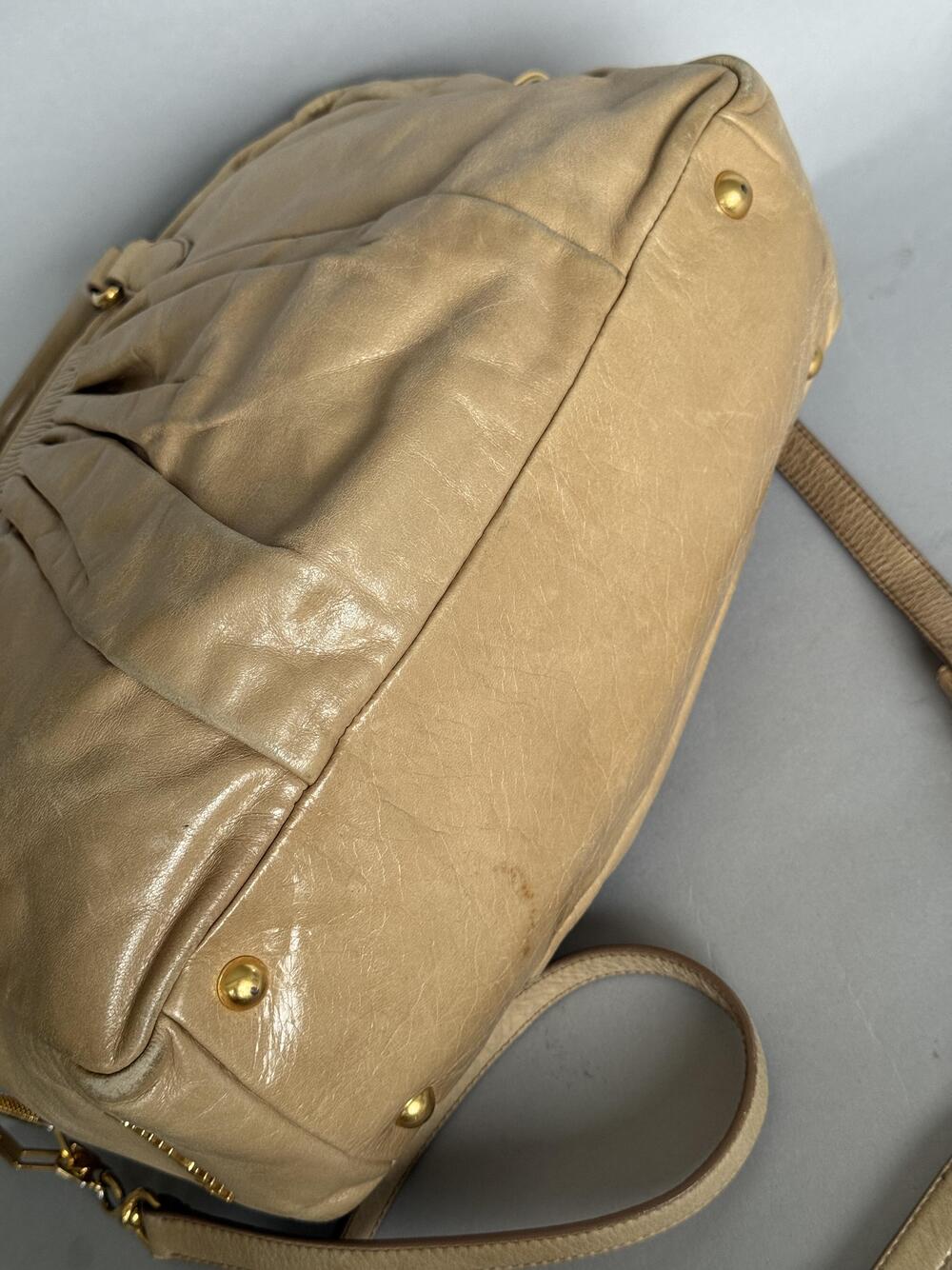 Mål: 30...Miu Miu veske i beige Nappa Lux skinn med gullfarget hardware. Den har 1 stort rom med en glidelås lomme inni. Logo på siden.