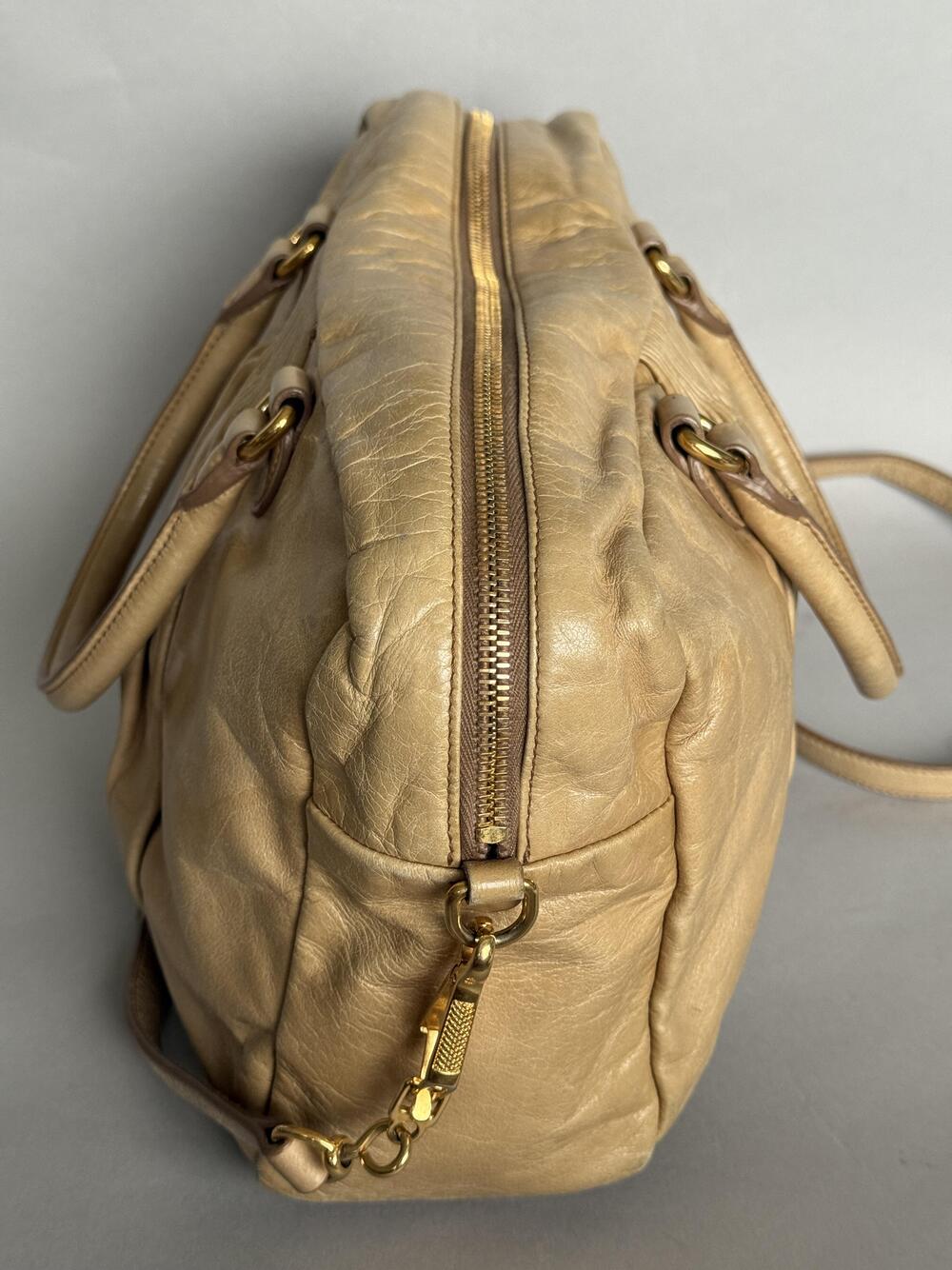 Miu Miu veske i beige Nappa Lux skinn med gullfarget hardware. Den har 1 stort rom med en glidelås lomme inni. Logo på siden.