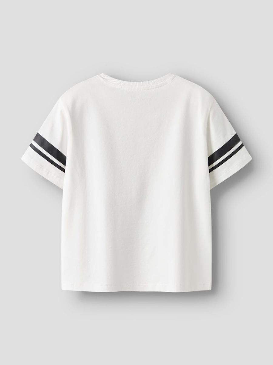 Dymi t-skjorte fra Name It med skimrende Stitch print foran og striper på ermene. Normal passform og størrelse.