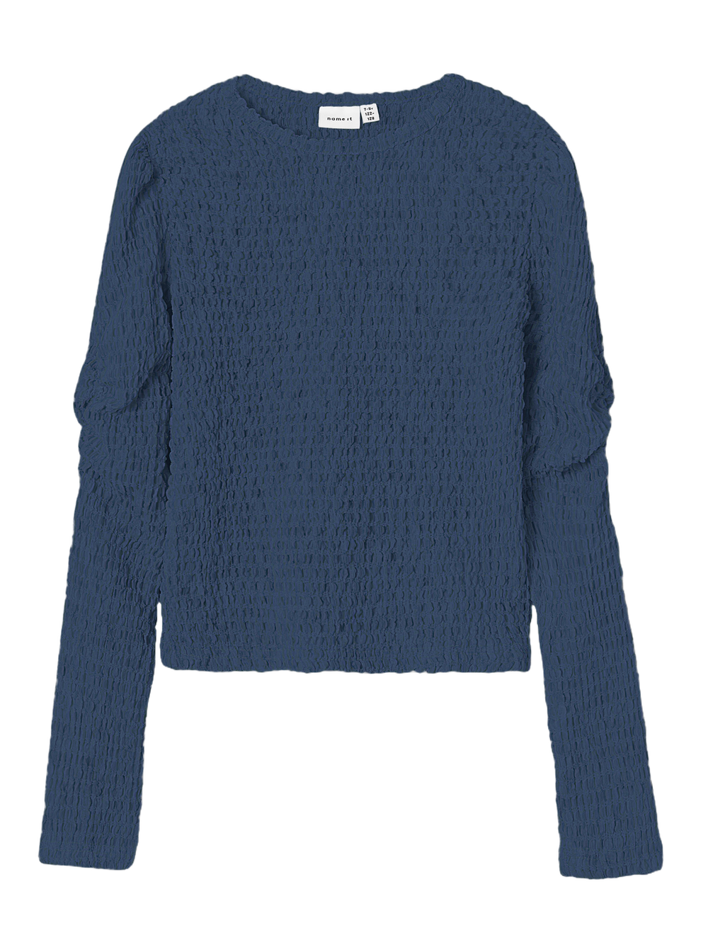 Fin smal topp i "smock" kvalitet. Elastisk over det hele, og struktur som "krepp".