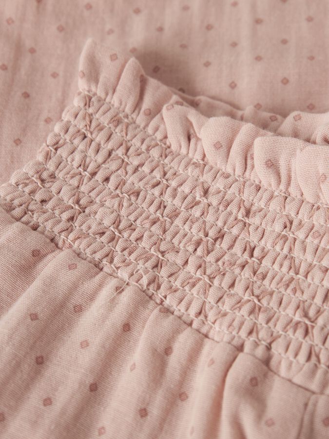 - Ekstra detaljer: Elastisk linning, merke og smock-detalj