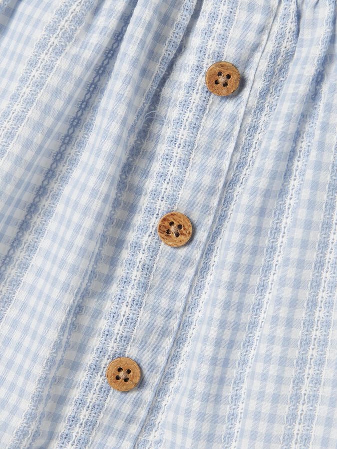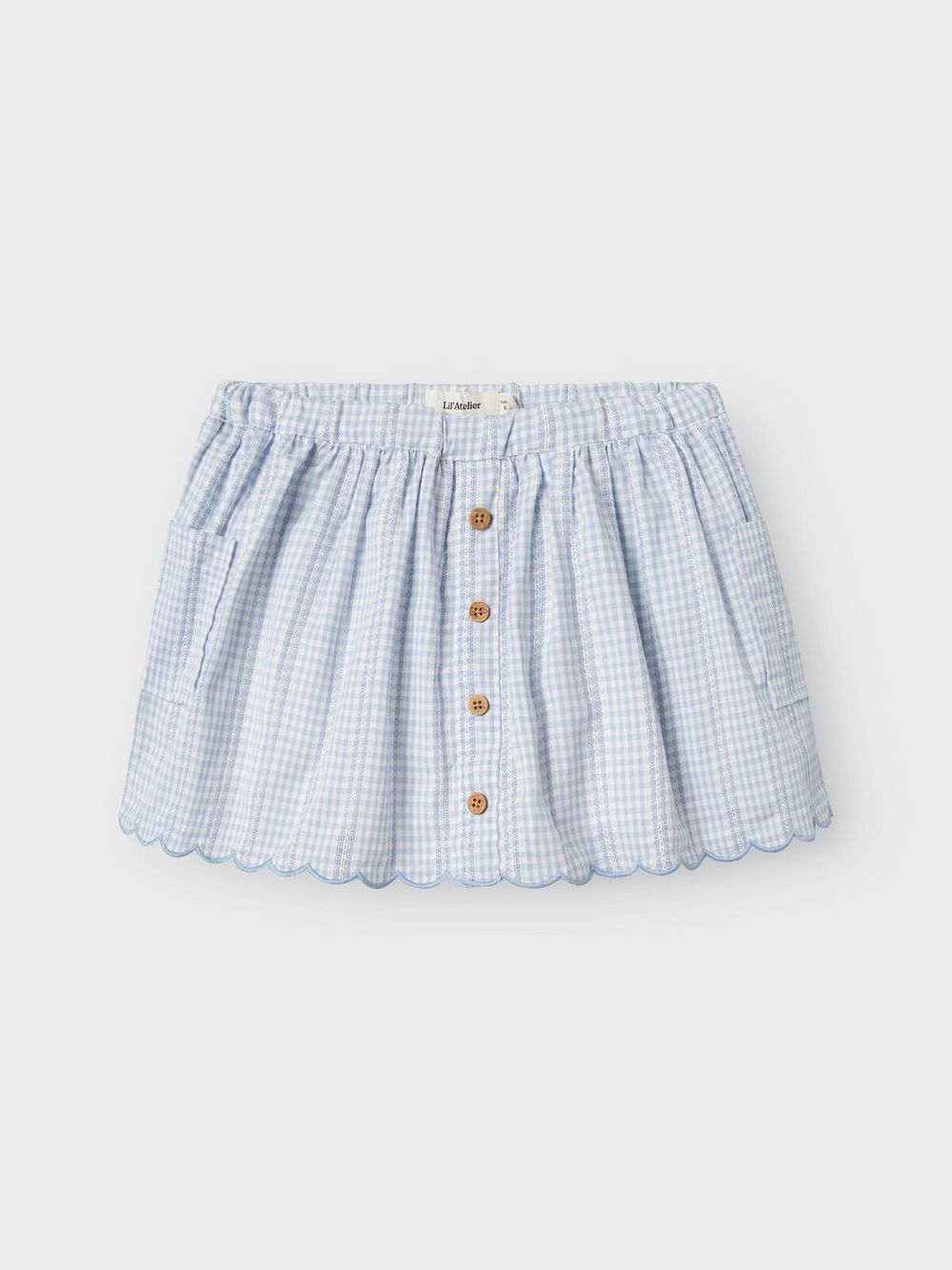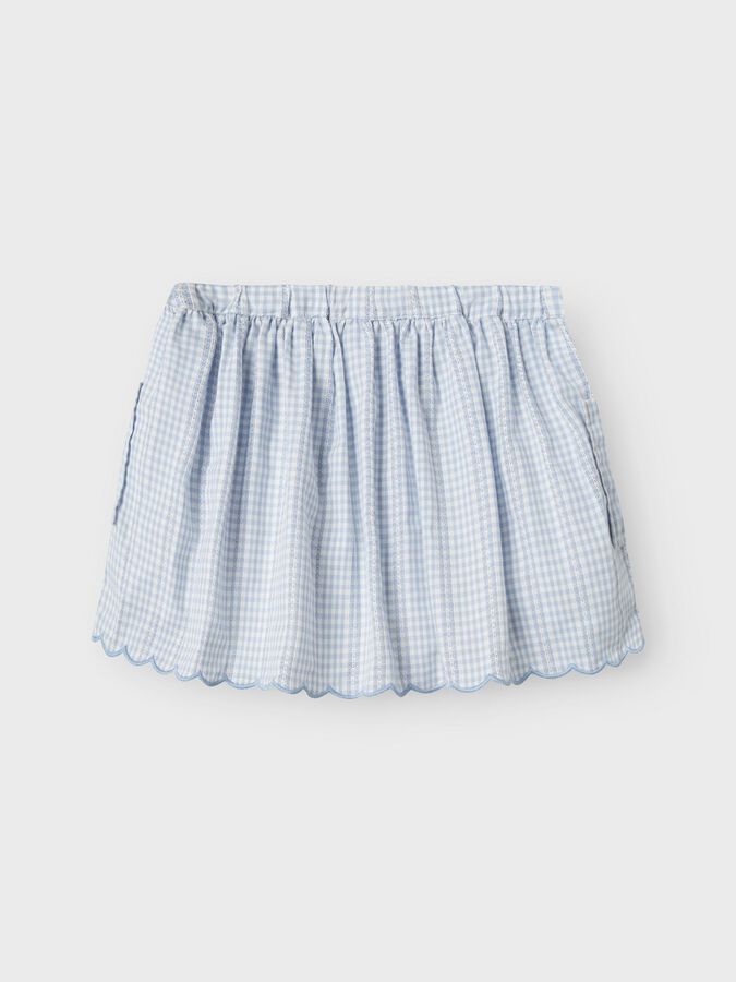 Nydelig skjørt i rutemønster. Lommer på sidene. Knappepynt i front. Kan justeres i midjen med elastisk stramming.