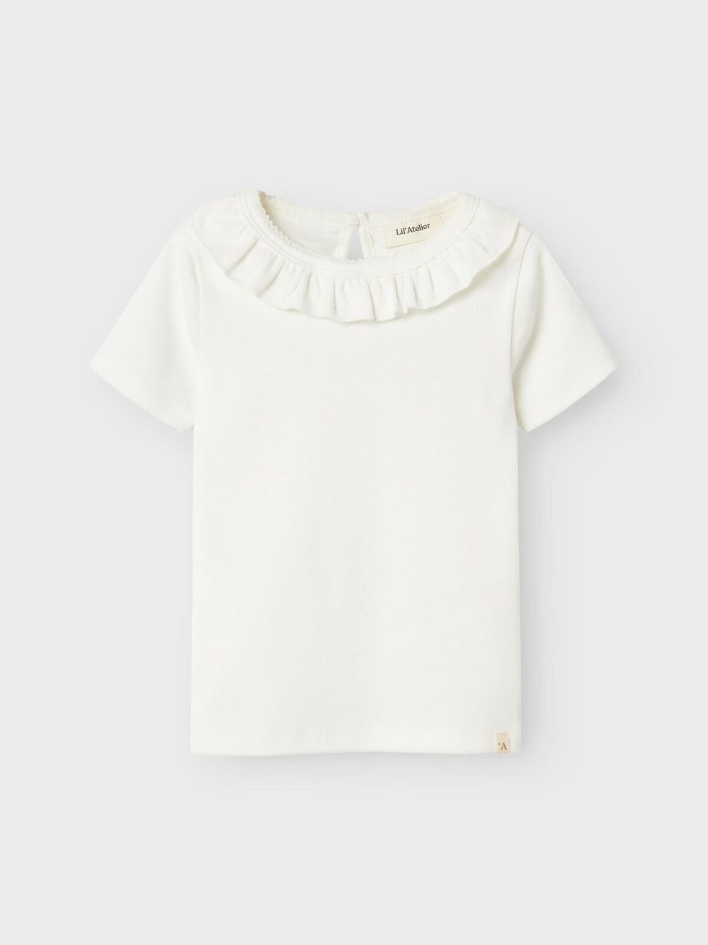 Søt kortermet topp med liten krage. Kneppeåpning bak. Fin detalj med treknapp.