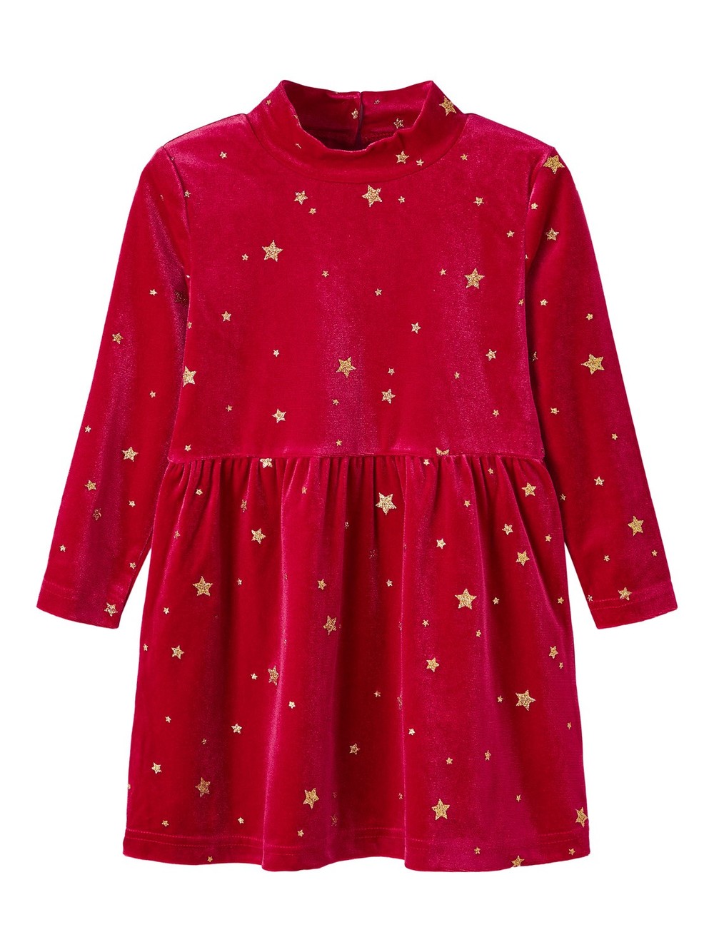 Nydelig velourkjole med lange armer. Strikk i midjen, som gjør at kjoln sitter fint på, uten å være for innsvinget. Dekorert med gullstjerner.
