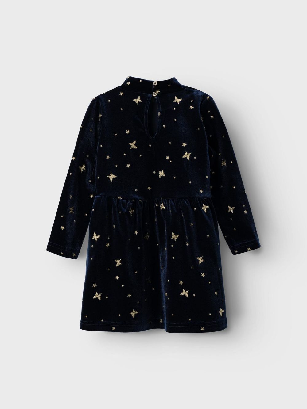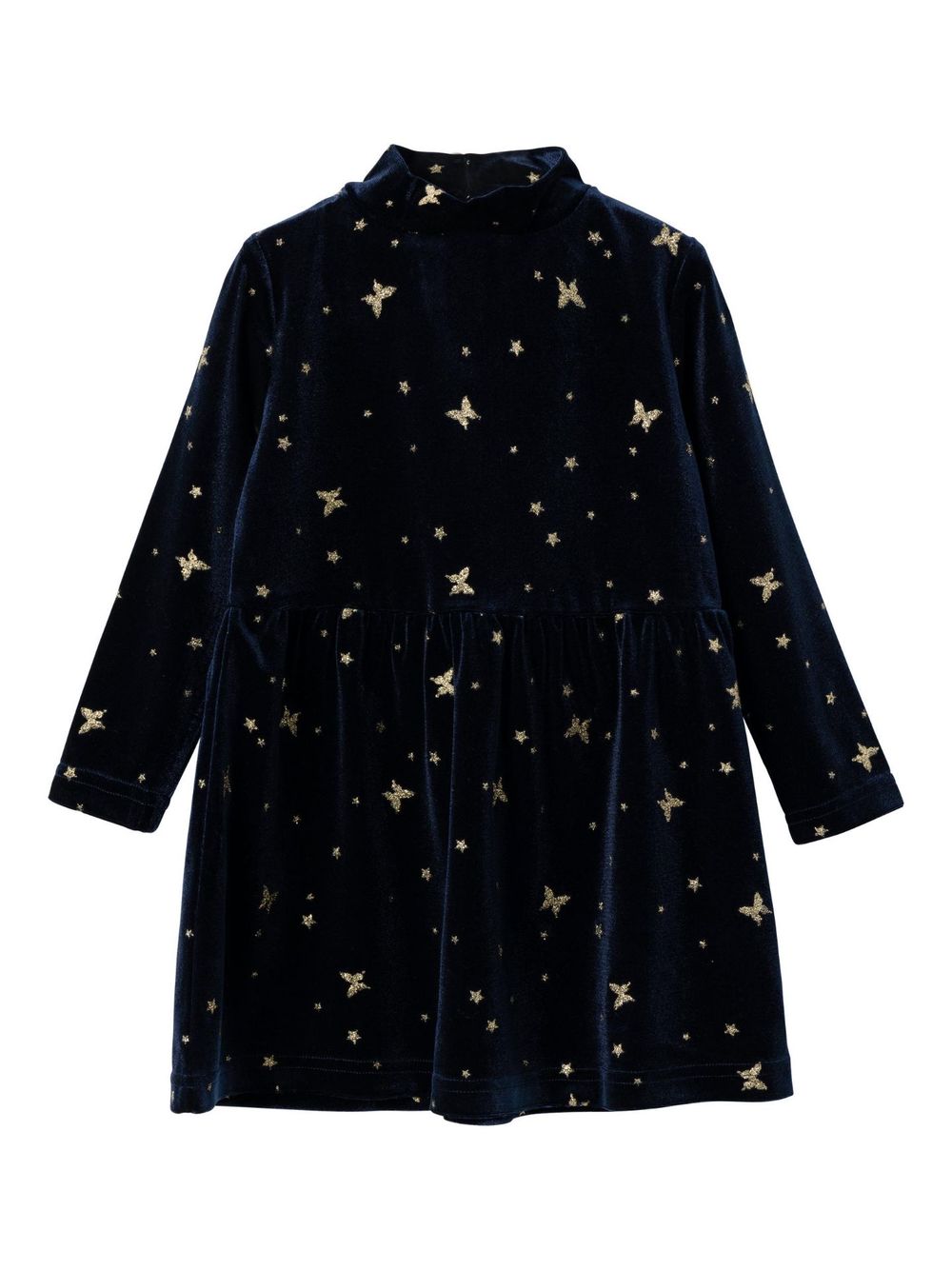 Kjole i velour, med sommerfugler og stjerner i glitter. Knepping øverst i ryggen bak.
