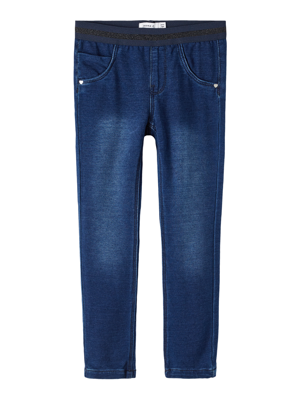 Supermyk bukse i sweat-kvalitet. Ser ut som dongeribukse. Strikk i midjen med glitterdetaljer.