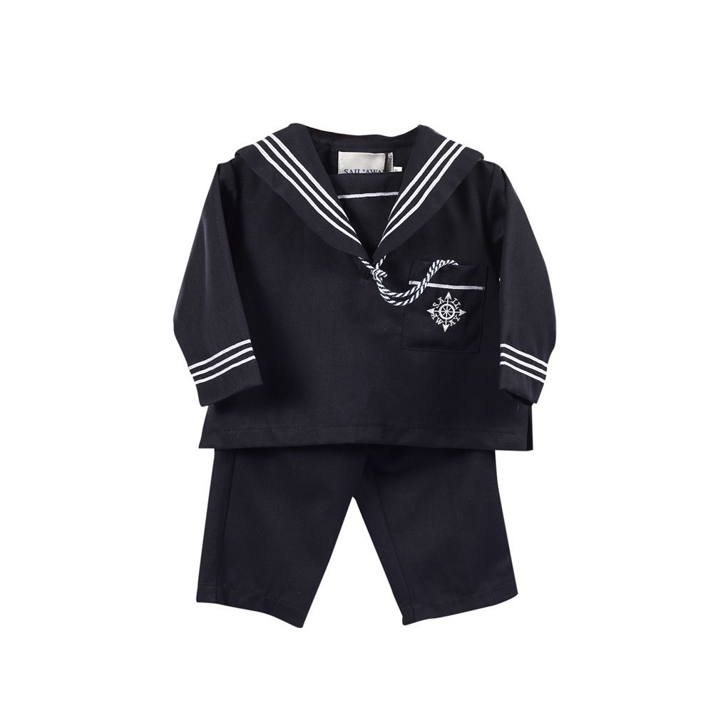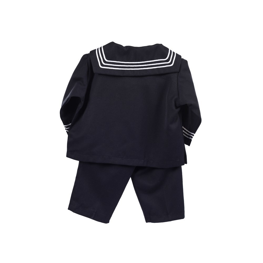 Klassisk marineblå matrosdress i to deler. Buksen har god strikk i livet. Overdelen har lomme foran på brystet og knappåpning på skulderen. Søt fløyte...Pascal barneklær-