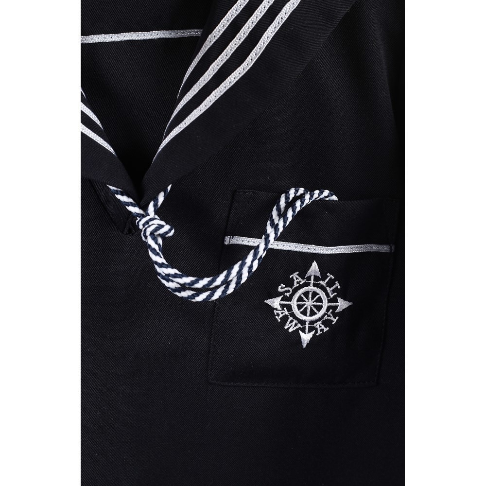 Klassisk marineblå matrosdress i to deler. Buksen har god strikk i livet. Overdelen har lomme foran på brystet og knappåpning på skulderen. Søt fløyte som passer til lommen foran. Denne kan taes helt av hvis man ønsker det.