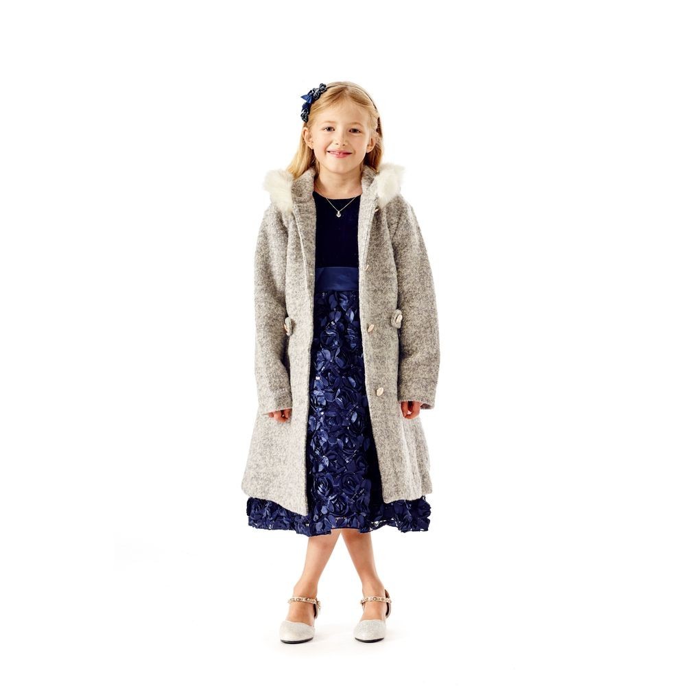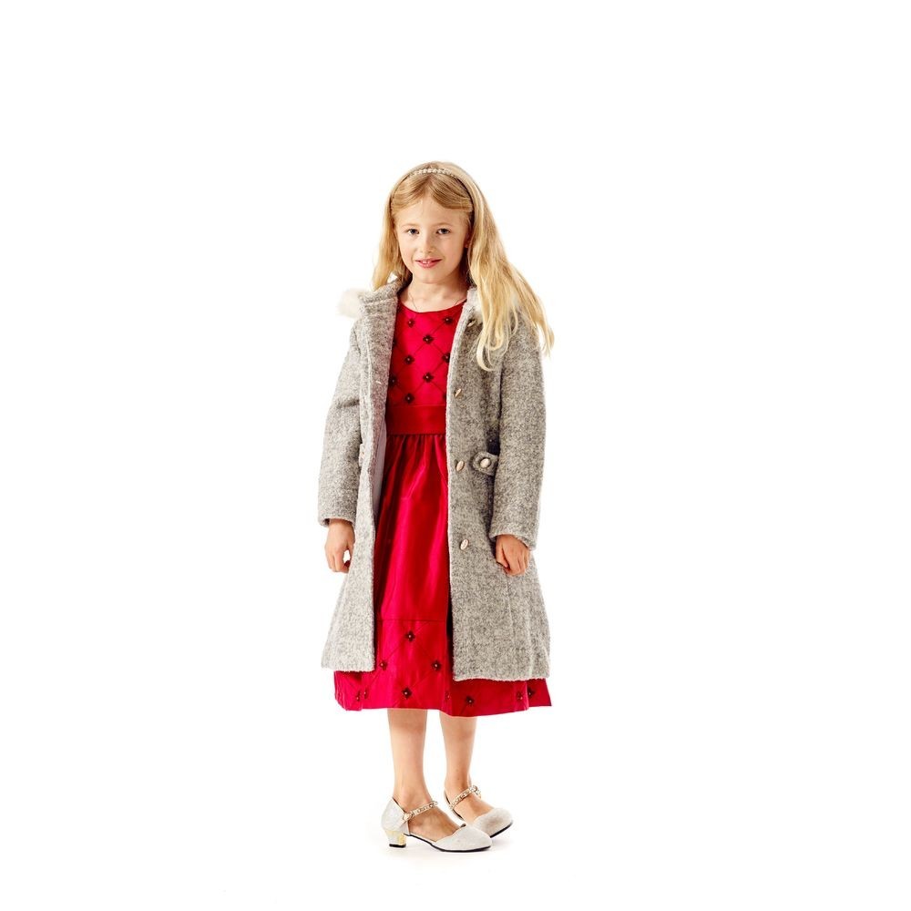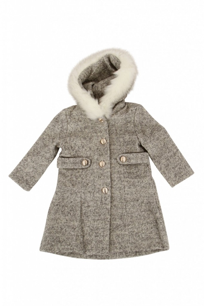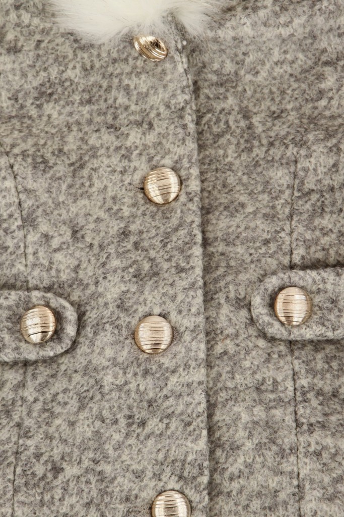 Ullkåpen har store blanke knapper. Hvit fuskepels på hetta. Søt sløyfe bak.