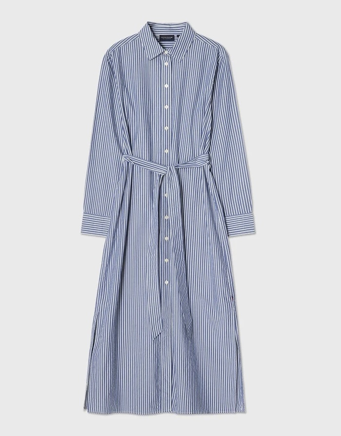 Perfekt for å gå fra uformell dagsantrekk til opphøyde helgeantrekk, legemliggjør denne skjortekjolen tidløs amerikansk stil med sitt klassiske stripemønster og raffinerte skredderdetaljer. Det sprø poplin-stoffet gir utmerket formbestandighet og enkel stell, noe som gjør den til et essensielt tilskudd til garderoben din.