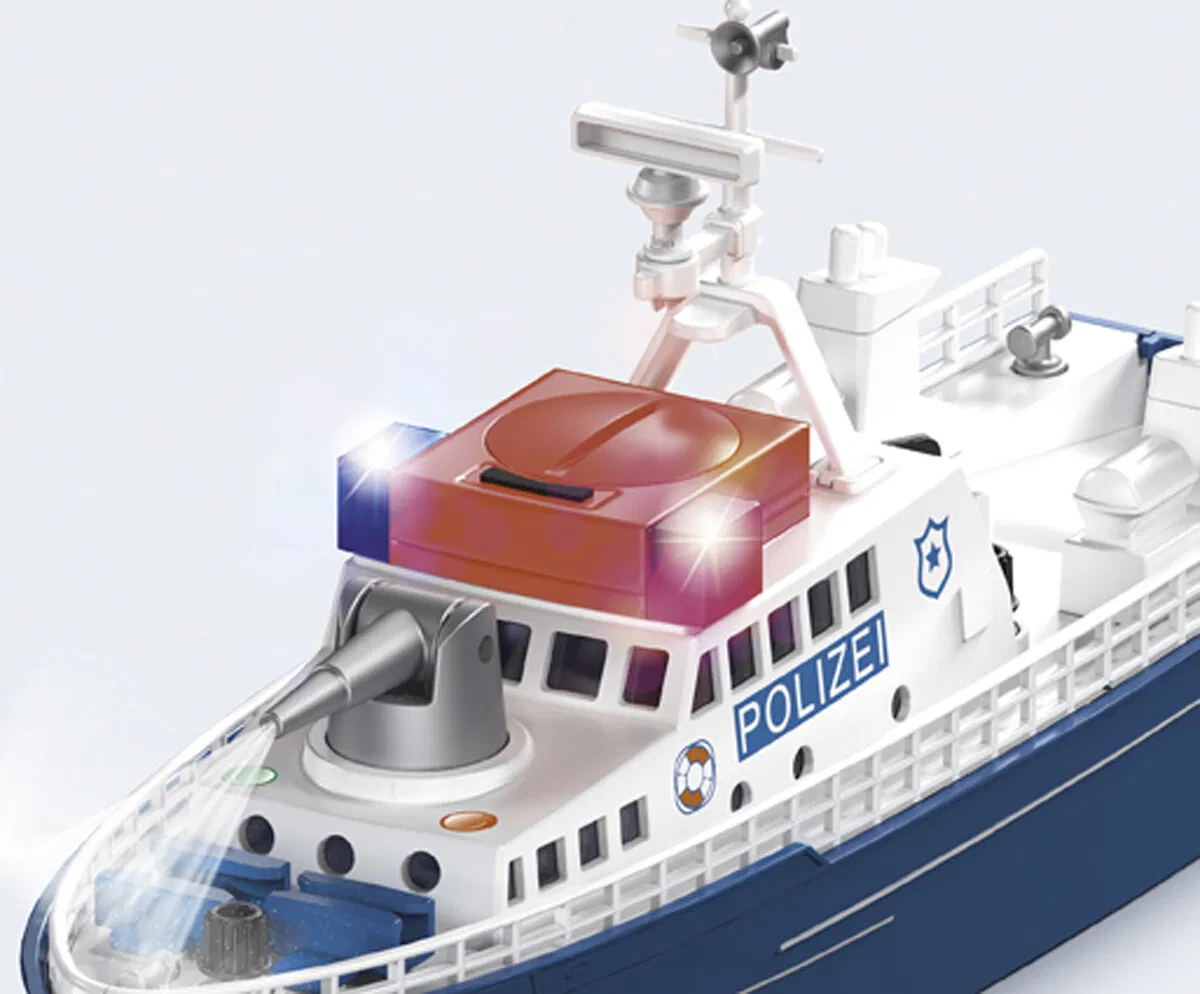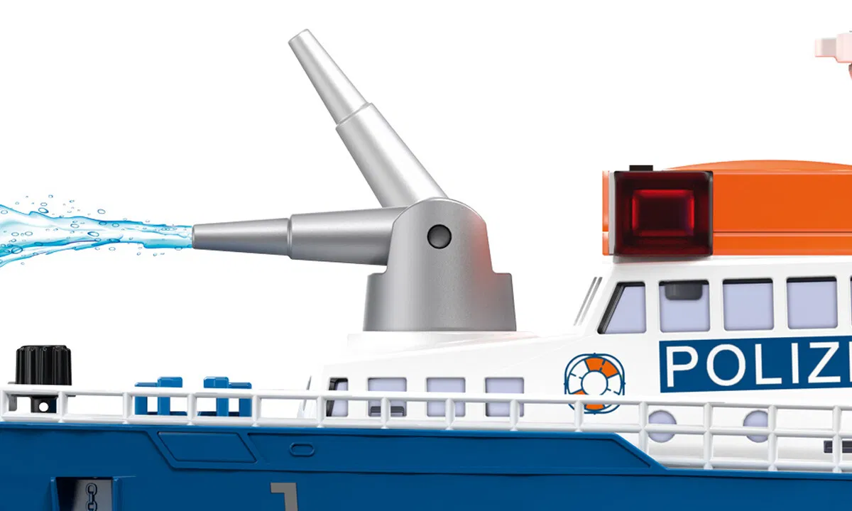 Flytbar politibåt med oppbevaringsplass for en annen båt etter et vellykket oppdrag. Et bredt spekter av funksjoner: LED-signallamper, elektrisk signalhorn, vannkanon, utfellbar bakluke, kabelvinsj, kan...Flytbar politibåt med oppbevaringsplass for en annen båt etter et vellykket oppdrag. Et bredt spekter av funksjoner: LED-signallamper, elektrisk signalhorn, vannkanon, utfellbar bakluke, kabelvinsj, kan drives via adapter med motorer til andre systemleker. Utmerket tillegg til andre varer i SIKU World-serien. Materiale: plast, Mål: 31,8 x 8,8 x 13,8 cm. Fra 3 år.Les mer