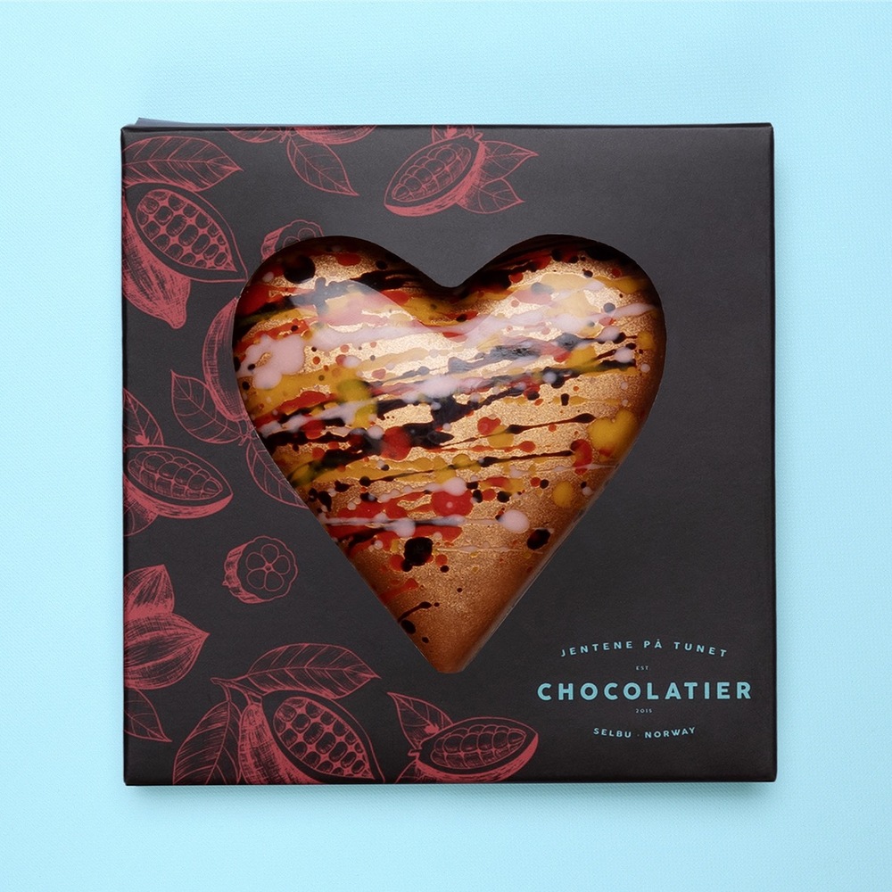 En nydelig gave...Et håndmalt, eksklusivt hjerte av Sjokoladefryd – fylt med vår smakfulle Hasselknas. Ren melkesjokolade fylt med knasende gode hasselnøtter fra Piemonte i Italia.