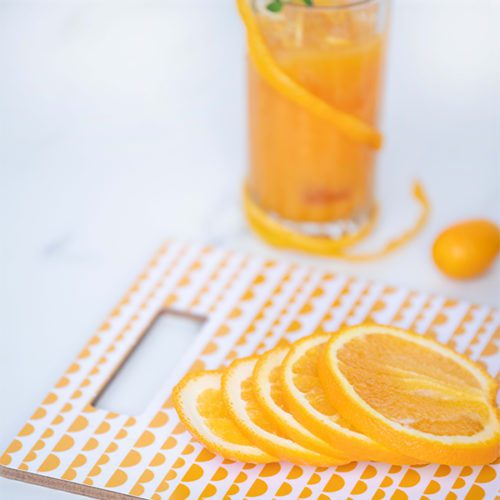 Skjærefjøl laget av FSC® sertifisert MDF. Den har en melaminbase utenpå slik at den er slitesterk og tåler varme. Det er håndtak så den kan...Skjærefjøl laget av FSC® sertifisert MDF. Den har en melaminbase utenpå slik at den er slitesterk og tåler varme. Det er håndtak så den kan henges opp og fjøla har design på begge sider. 30 x 20 cm.Les mer