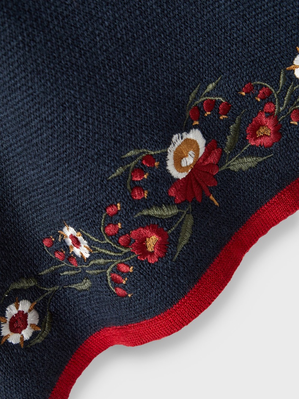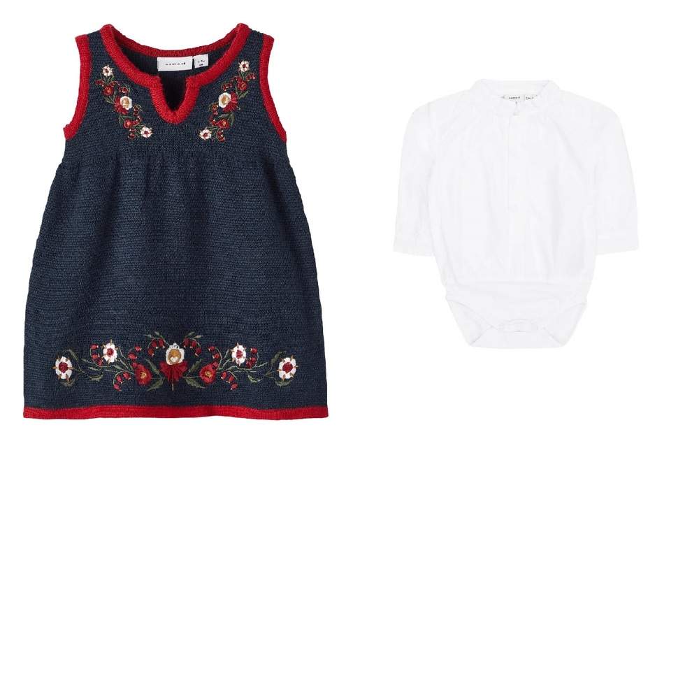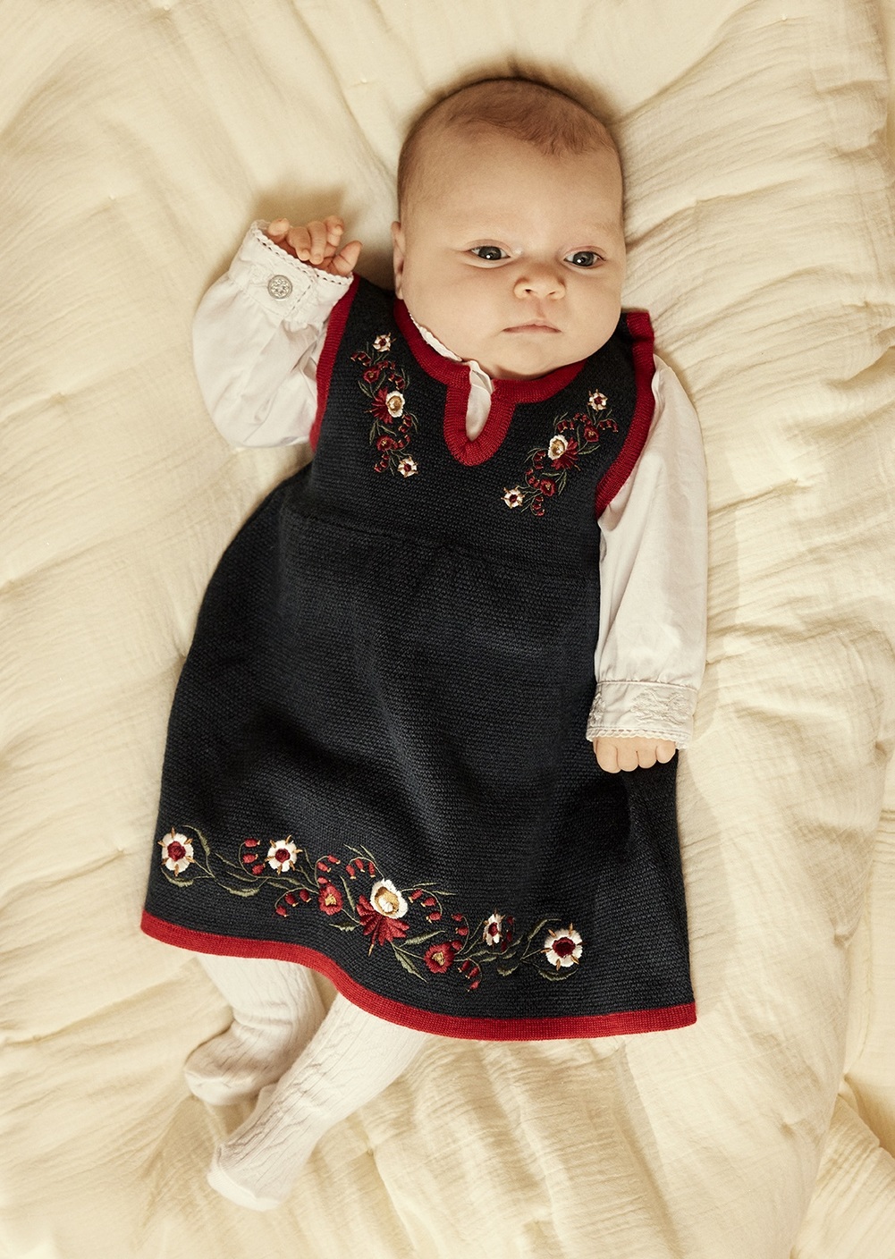 Søt strikket barnefestdrakt til de minste. Drakt med mange fine detaljer og flott festdrakt body følger med. Alt kan vaskes på 40 grader.