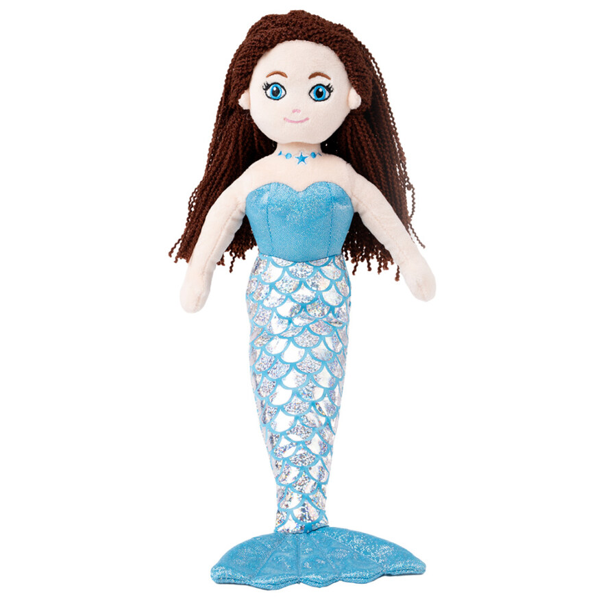 En nydelig og myk havfrue som inviterer til fantasifull lek både på land og i magiske undervannsverdener. Havfruen har glitrende finner med skimrende skjellmønster, et...En nydelig og myk havfrue som inviterer til fantasifull lek både på land og i magiske undervannsverdener. Havfruen har glitrende finner med skimrende skjellmønster, et fint brodert ansikt og garnhår som er lett for små hender å gripe, style og flette. Den myke kroppen gjør den behagelig å kose med. Den glitrende toppen og broderte halskjedet gir ekstra eventyrpreg og inspirasjon til rollelek.