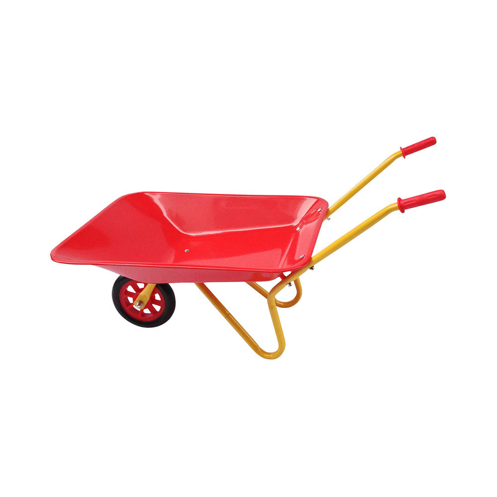 Trillebår i metall i fargene rød og gul. Med denne kan den lille gartneren hjelpe til med hagearbeid.