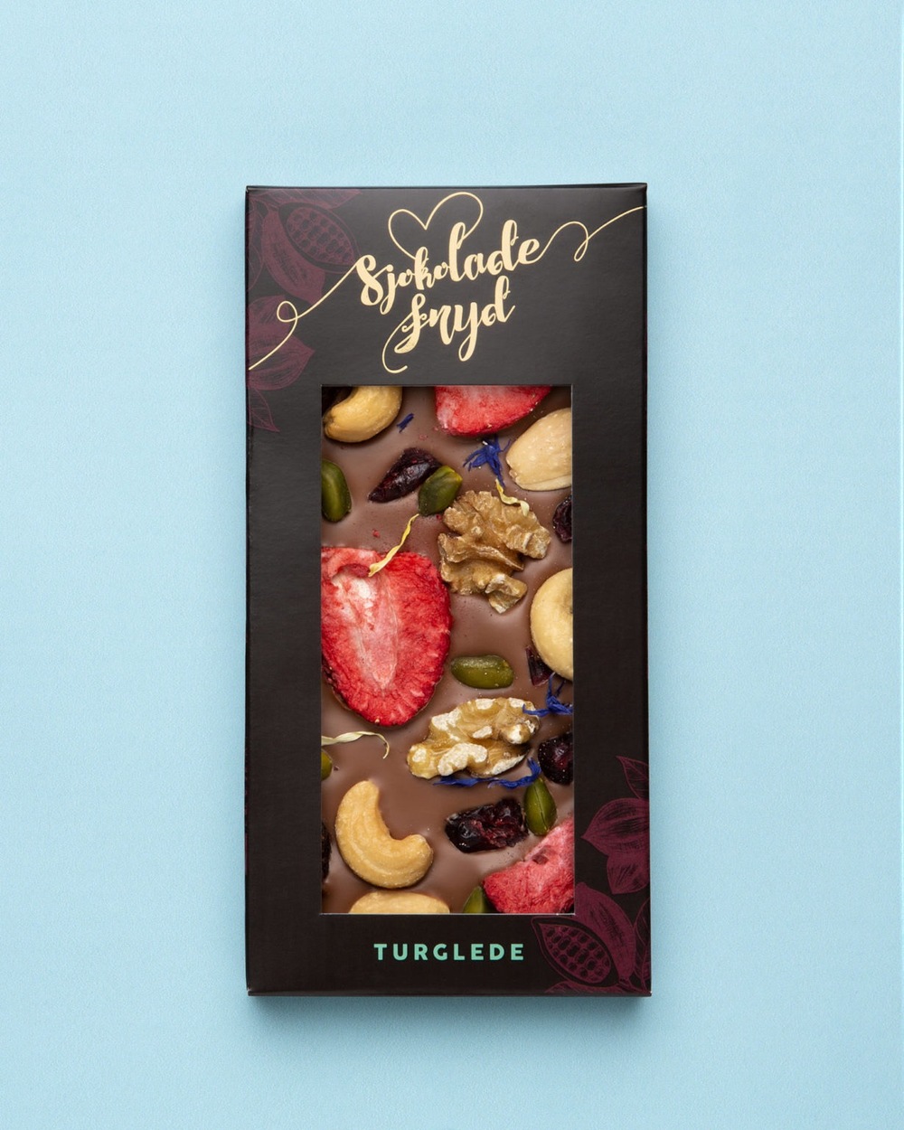En stor sjokoladeplate med himmelsk melkesjokolade, raust dekorert med ulike nøtter og bær. Denne topper turopplevelsen, og hver eneste bit gir faktisk sin helt egen...En stor sjokoladeplate med himmelsk melkesjokolade, raust dekorert med ulike nøtter og bær. Denne topper turopplevelsen, og hver eneste bit gir faktisk sin helt egen smaksopplevelse. Turglede byr på et herlig mellommåltid, full av nyttige antioksidanter, vitaminer og gode fettsyrer.
