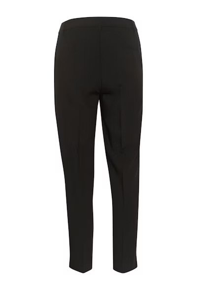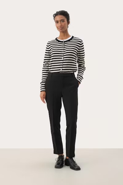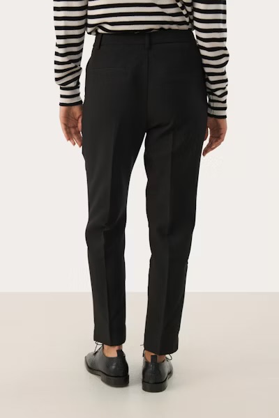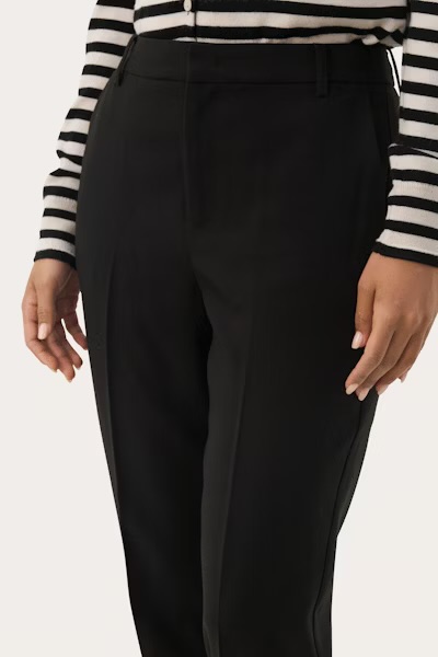 Dressbukser med rett passform og ren linning. Beltehemper og pressede folder gir en elegant og veldefinert silhuett.