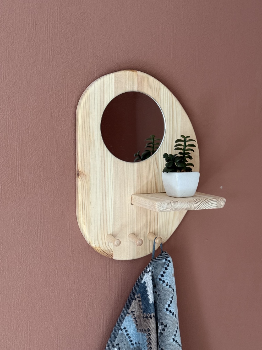 Vegghengt hylle i lyst tre, med speil og 3 knagger.