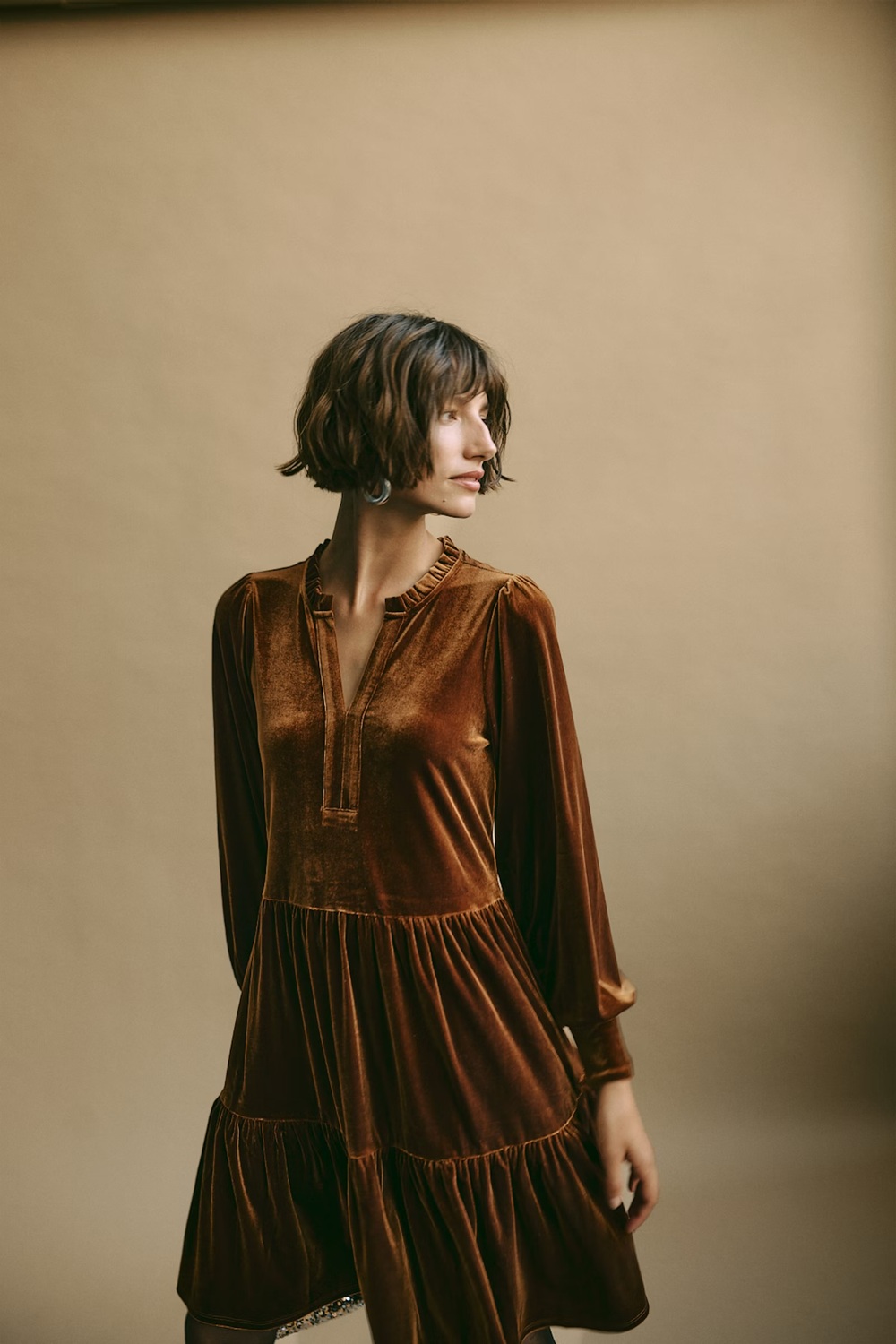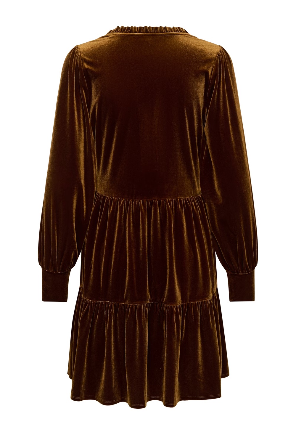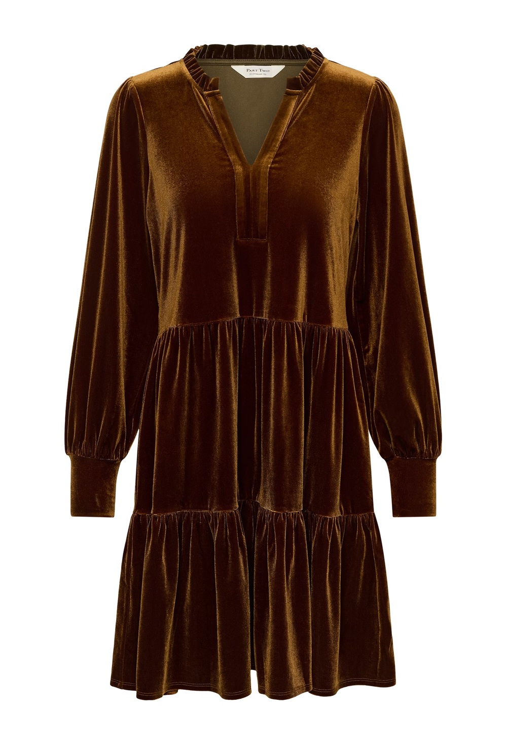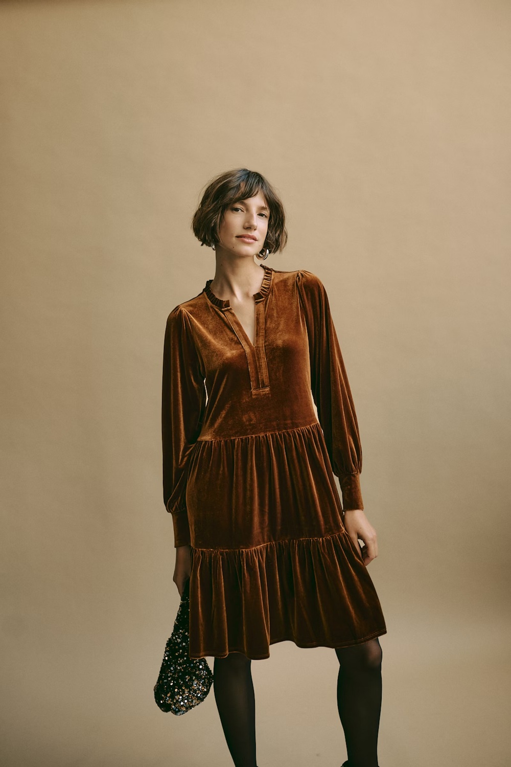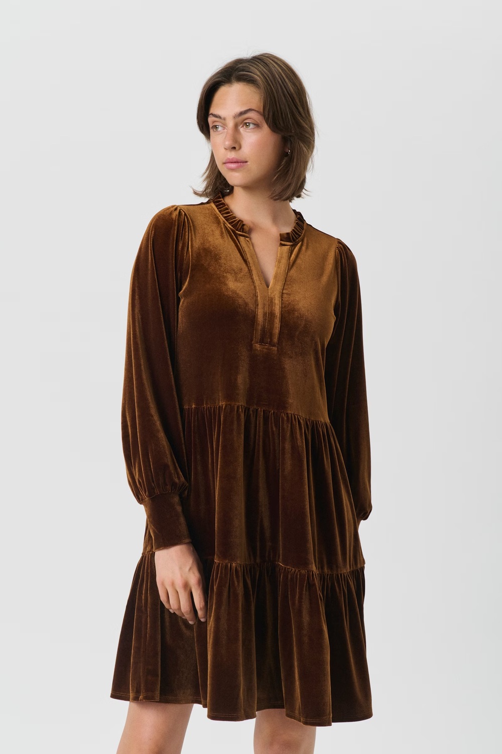Denne korte kjolen fra Part Two i myk fløyel har en elegant passform med fine volangdetaljer ved halsen og lett vidde i skjørtet. De lange ermene avsluttes med elastiske mansjetter som gir et avslappet og feminint uttrykk. Bruk den med støvler til hverdags eller med hæler til fest.