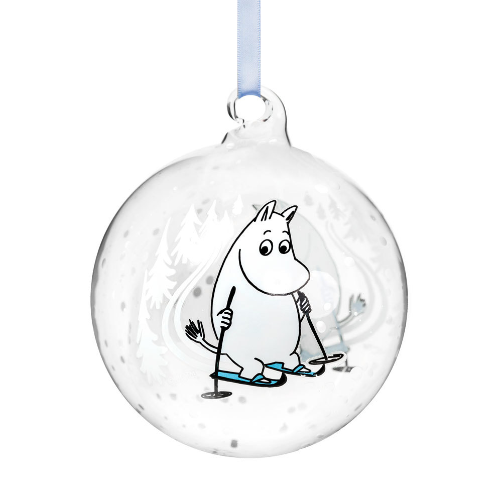 Dekorasjonskule i glass med satengbånd og motiv av Snorkfrøken ridende på et reinsdyr. Mummis vintermagi handler om å nyte julen og vinteren. Kulene er beregnet...Dekorasjonskule i glass med satengbånd og motiv av Snorkfrøken ridende på et reinsdyr. Mummis vintermagi handler om å nyte julen og vinteren. Kulene er beregnet å skulle henge i juletreet, men kan også bli flotte andre steder i huset - f.eks.i et vindu.