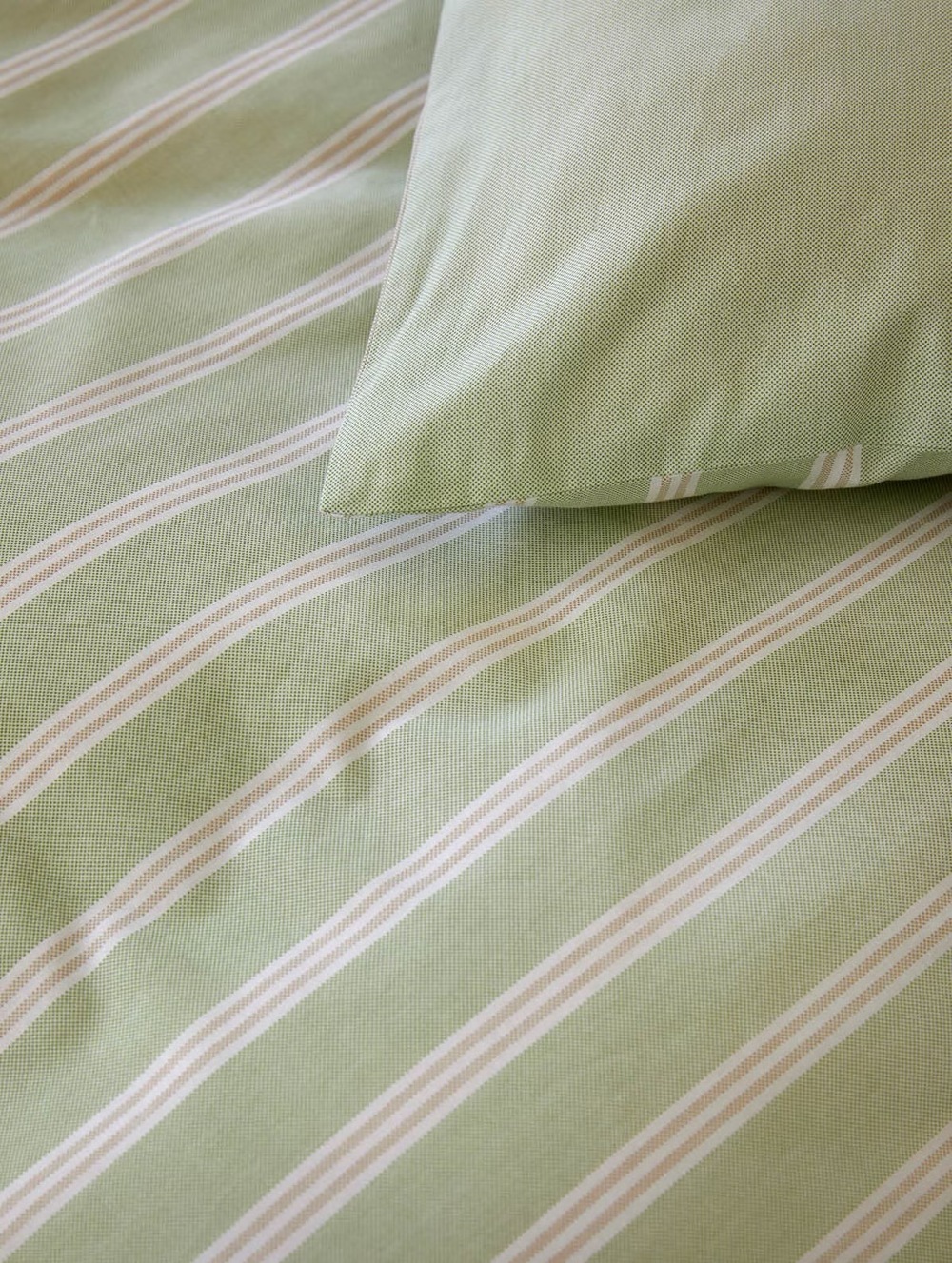Den milde vårgrønne fargen gir rommet et friskt og balansert uttrykk, mens de smale stripene skaper et rent og klassisk design som passer i alle hjem. Sengesettet er også behandlet med Easy Care, som gjør at det krøller mindre og ser fresht ut – selv etter mange vask.