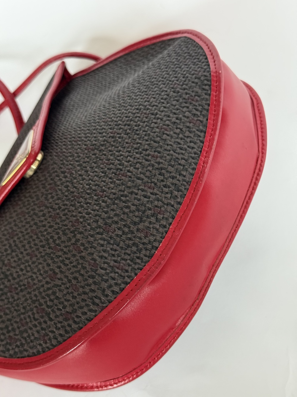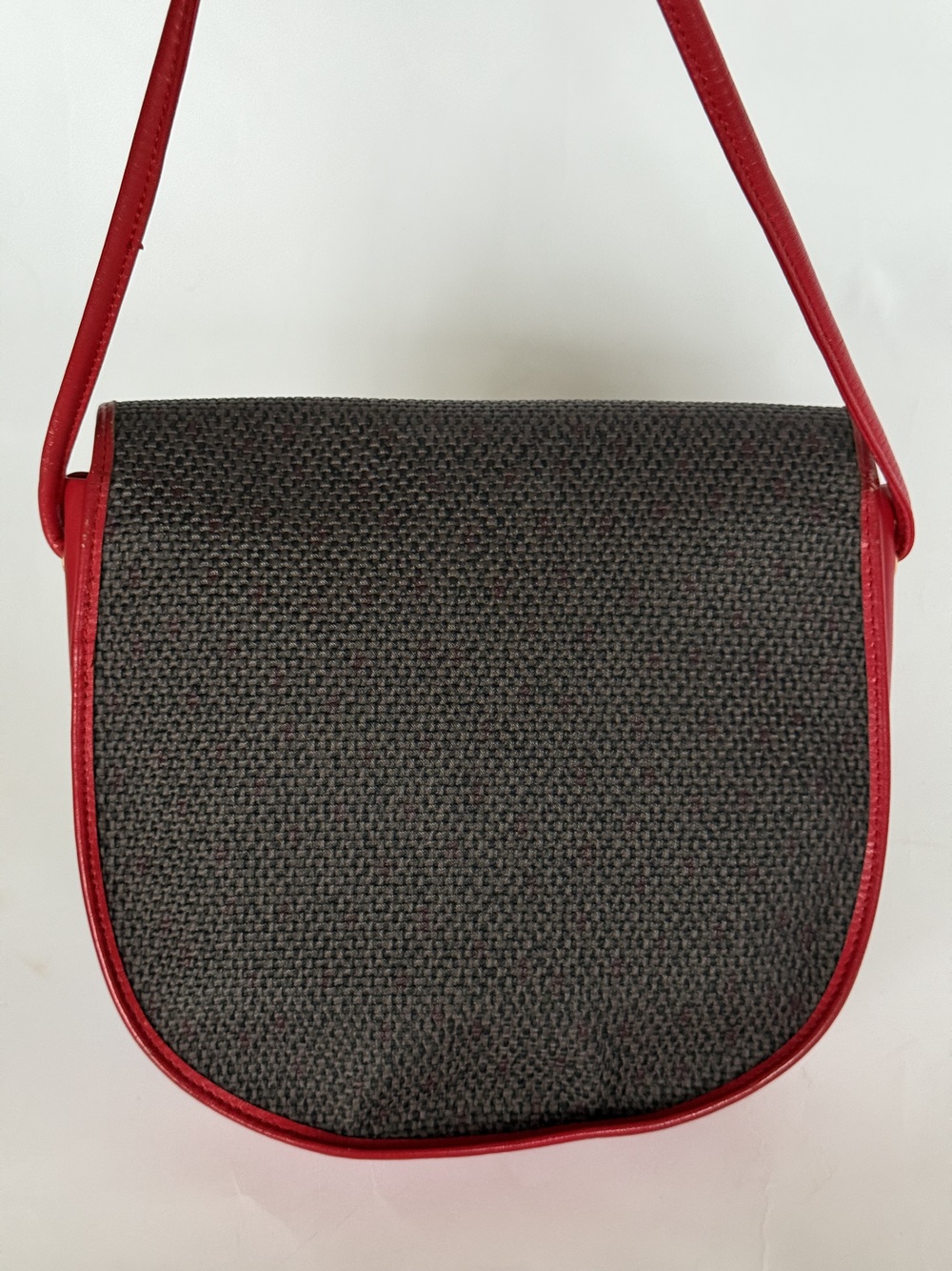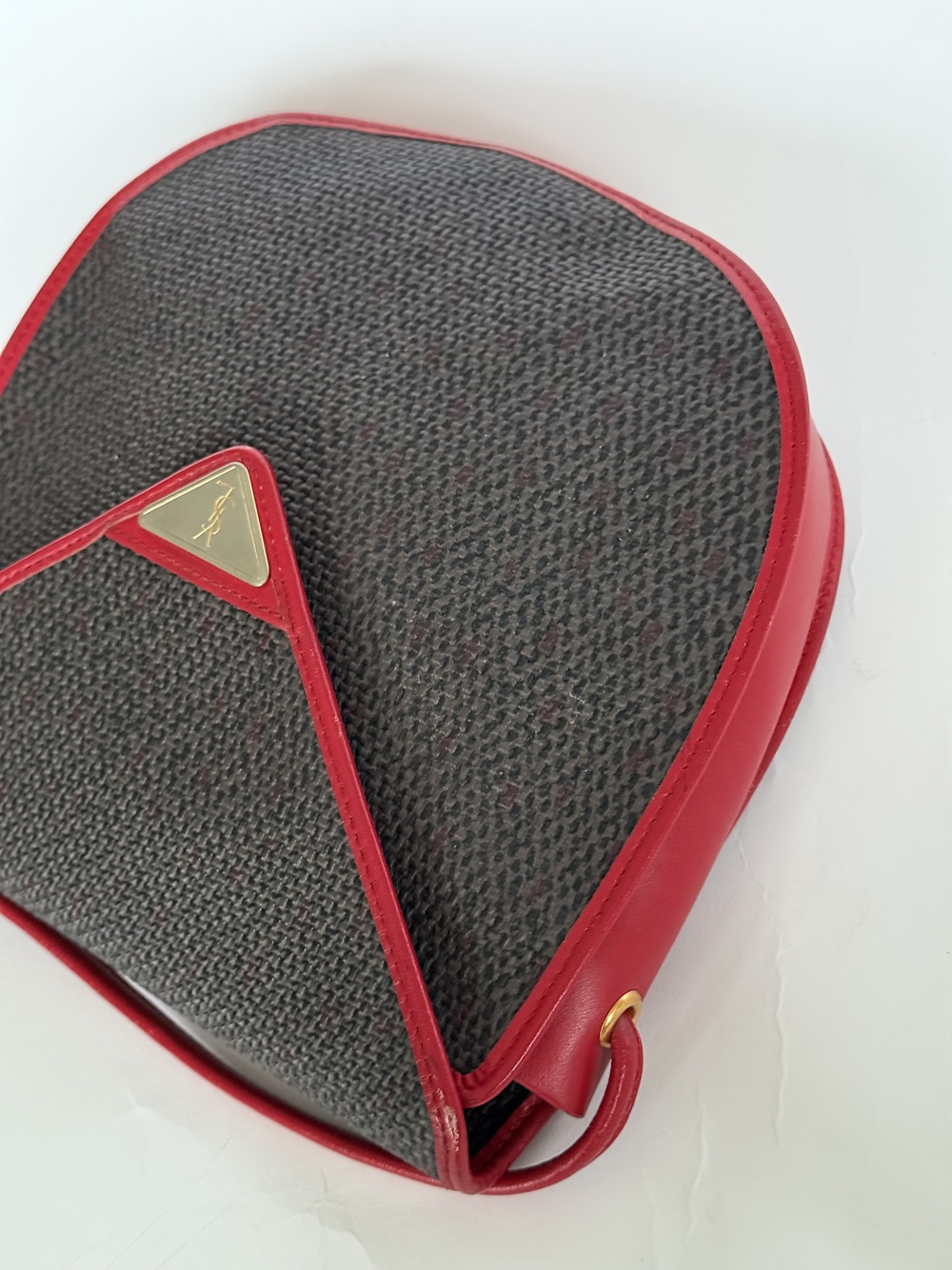 Tilstand: Fin vintage stand, noen...YSL veske i svart/grå canvas med detaljer i rødt skinn. Den har et stor rom inni og et lite med glidelås.